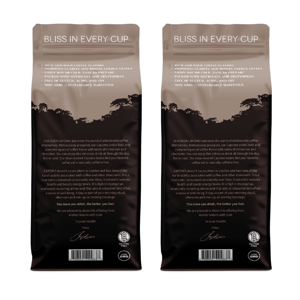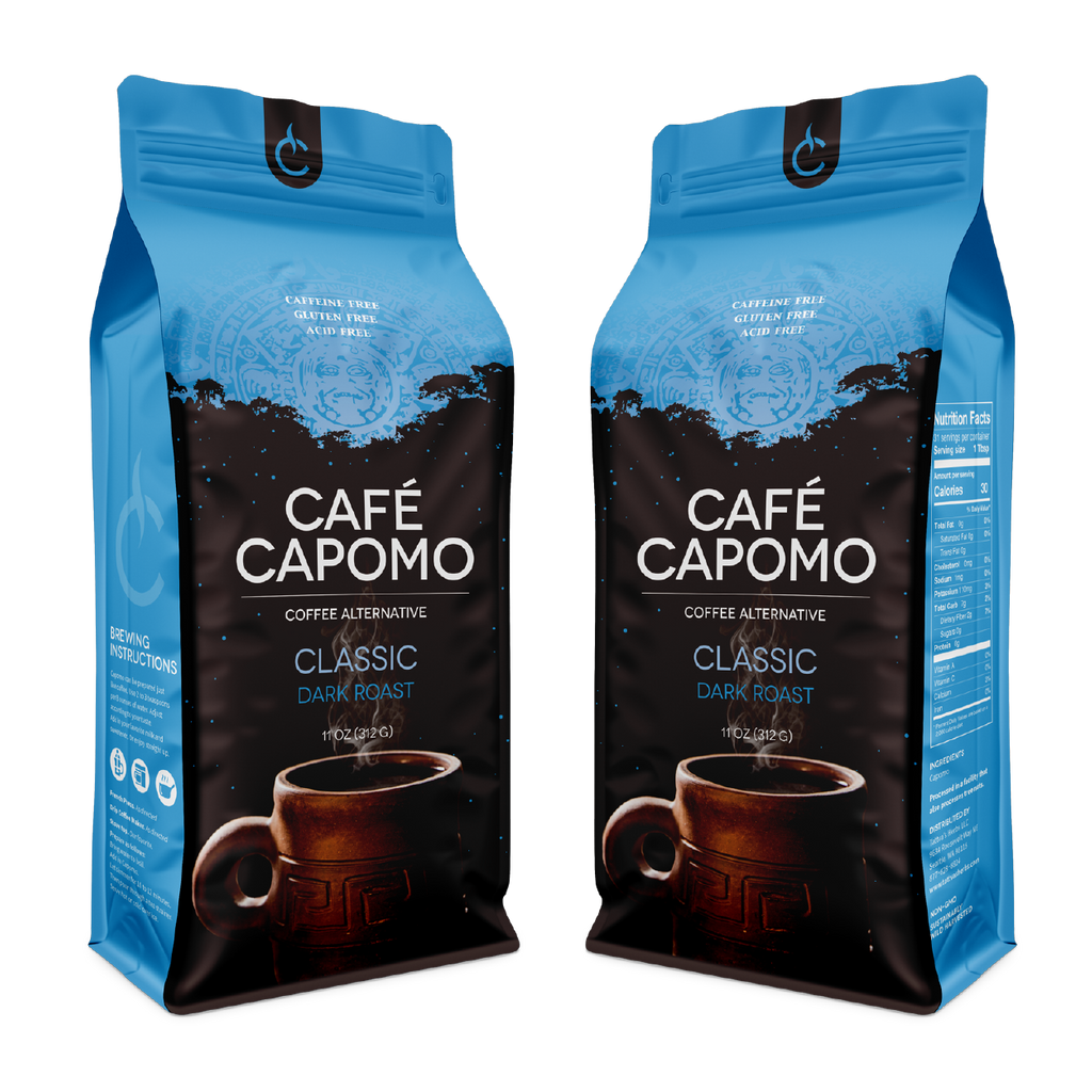 Buy the classic dark roast natural coffee substitute from Cafe Capomo. It is high in potassium, fiber, calcium, tryptophan, iron, zinc and vitamins A, B, C and E. 11 oz.